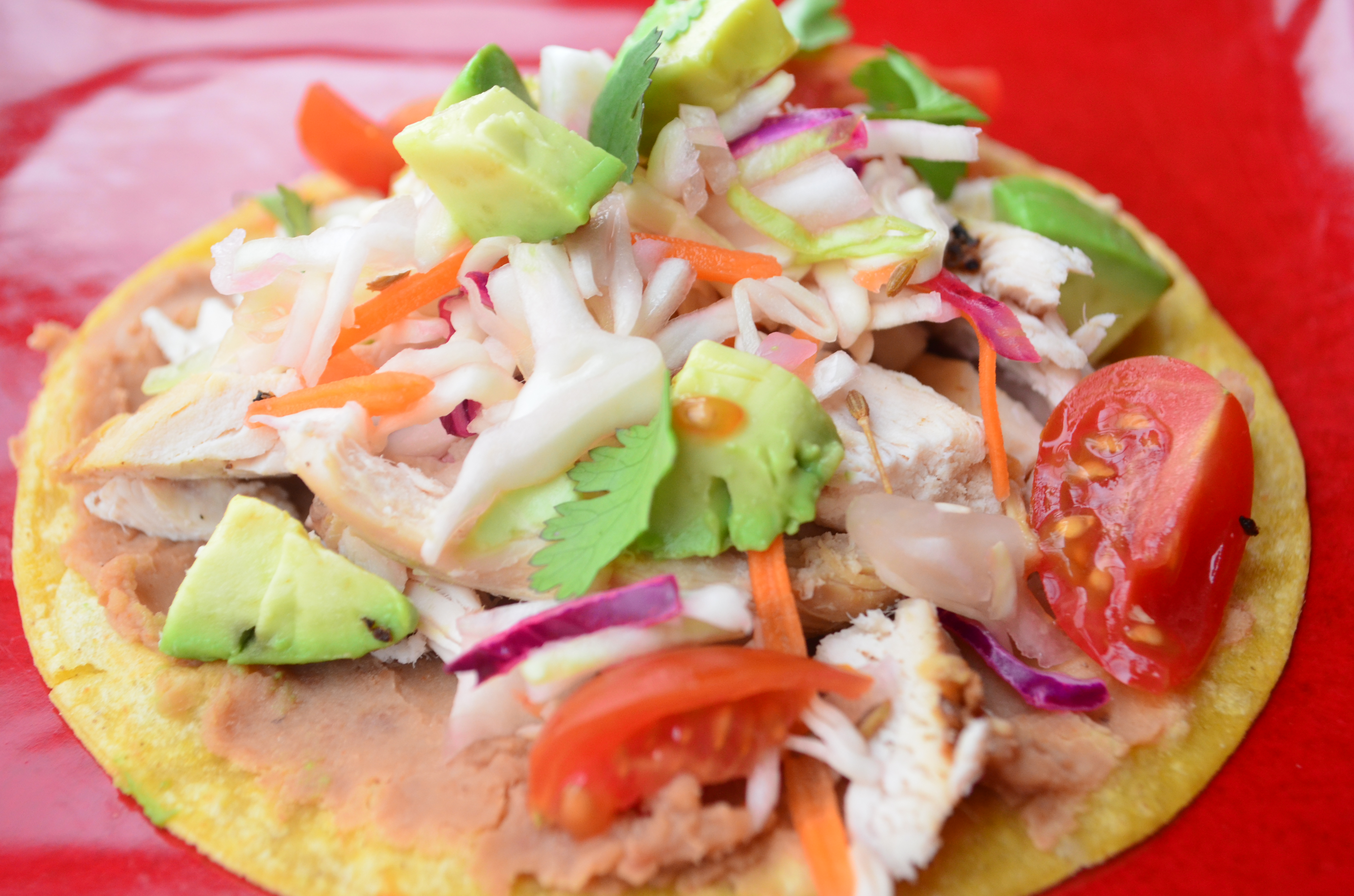 Then assemble tostadas: spread beans on the shell, then chicken, salsa, slaw, sour cream and slice avocado.