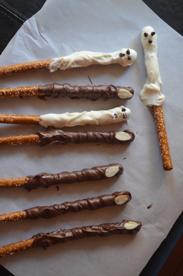 My Assorted Dipped Spooky Pretzels are a combination of pretzel rods dipped in chocolate with an almond sliver that makes it look like a finger, and pretzel ghosts dipped in almond bark with miniature chocolate chip eyes.  The great thing about Halloween is it’s the one time of year that if you mess up what you’re making it doesn’t matter because it can just look scary. For example, misplaced eyes on my pretzel sticks don’t look bad but that would be a completely different story if this was Christmas and those were snowmen. They’d look deranged.