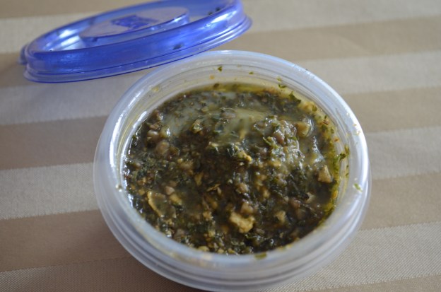 I recommend buying mini plastic storage containers to freeze basil in smaller portions (about ½ to 1 cup at a time). My husband is a teacher and one of his co-workers, Janice Queen, makes amazing pesto. I asked her to share her recipe. Something I really like about this recipe is it calls for almonds, as well as pine nuts (pine nuts are very expensive, so this is a more economical recipe). The recipe also calls for a good dose of parsley, which is nice if you’re growing that, too.